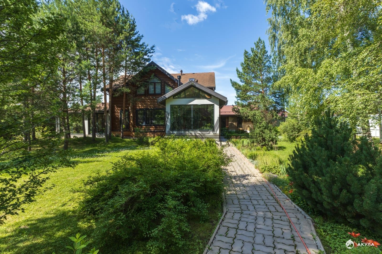 на участке ландшафтный дизайн, много хвойных деревьев, краснокнижных растений, обустроены дорожки.
