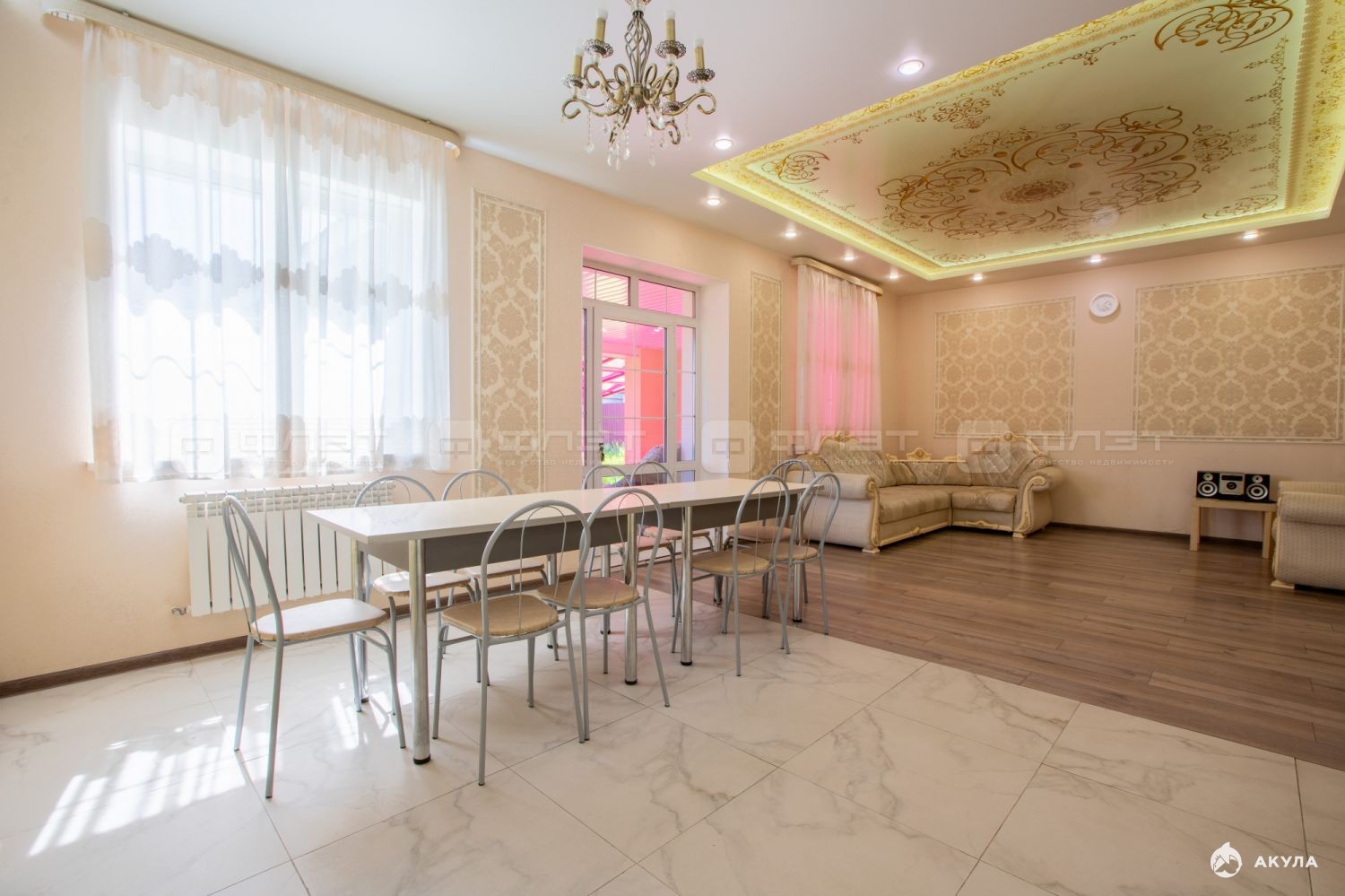 Просторный зал с кухней и выходом на веранду.