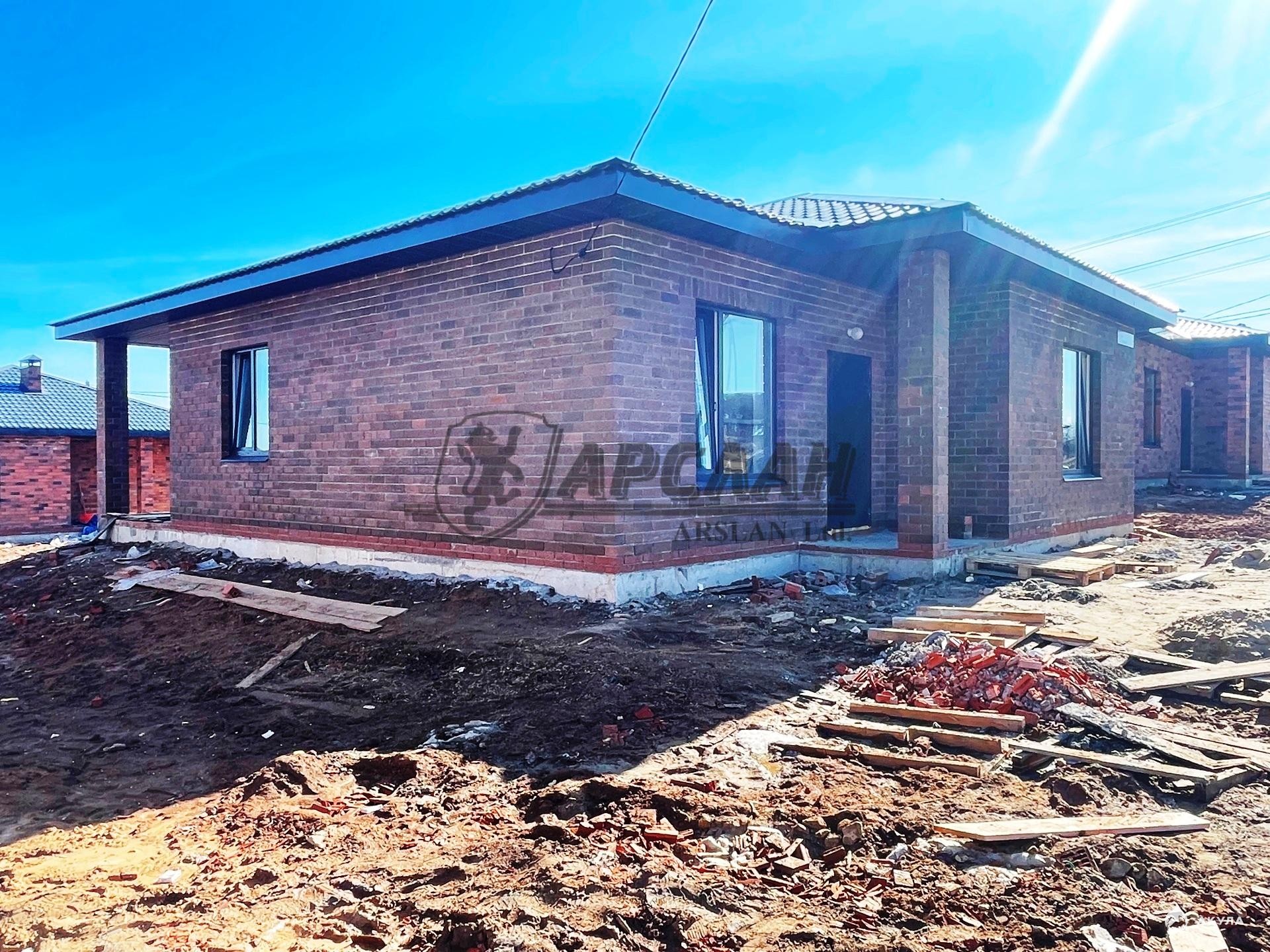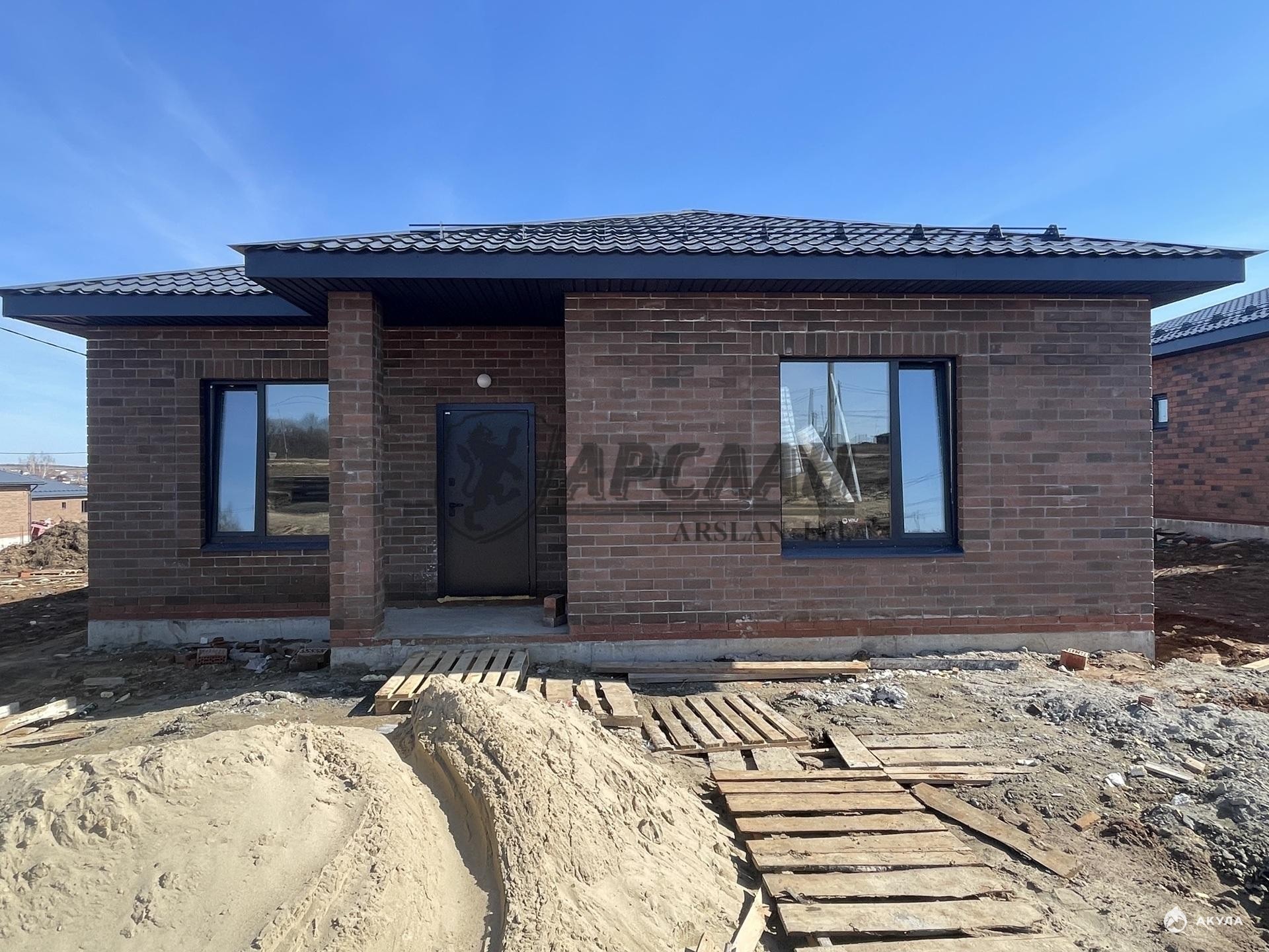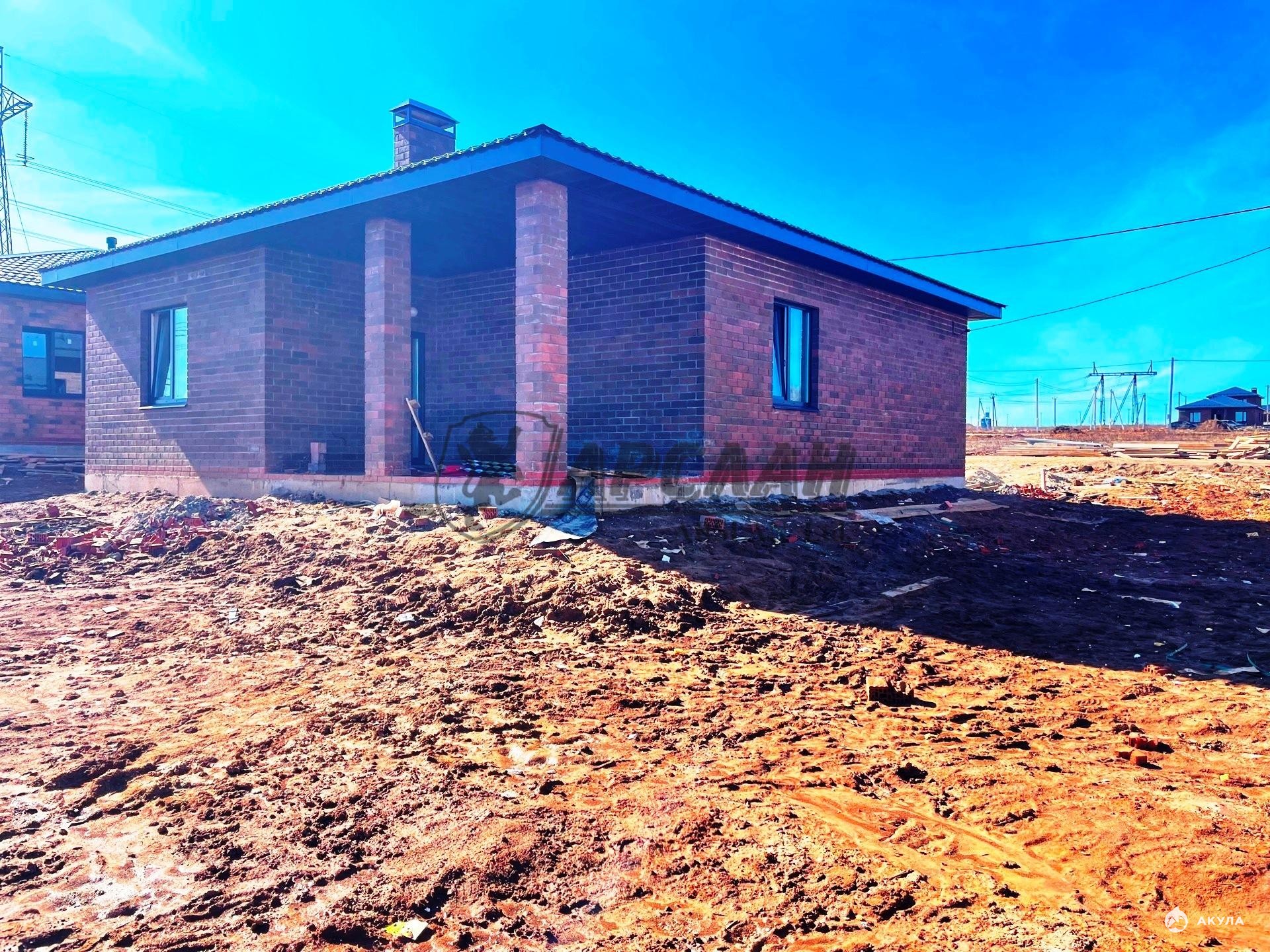 Новый одноэтажный кирпичный дом с террасой и котельной.