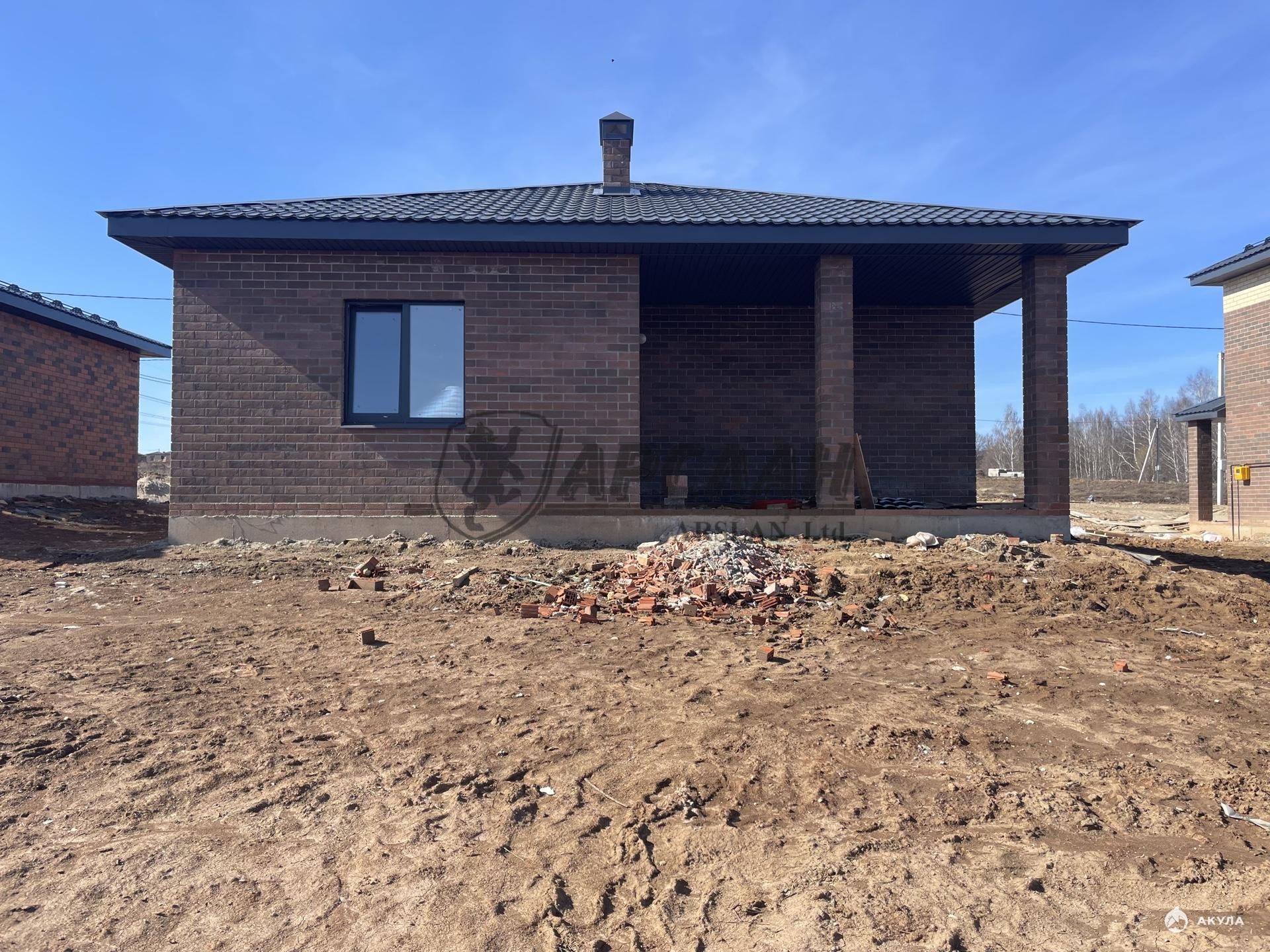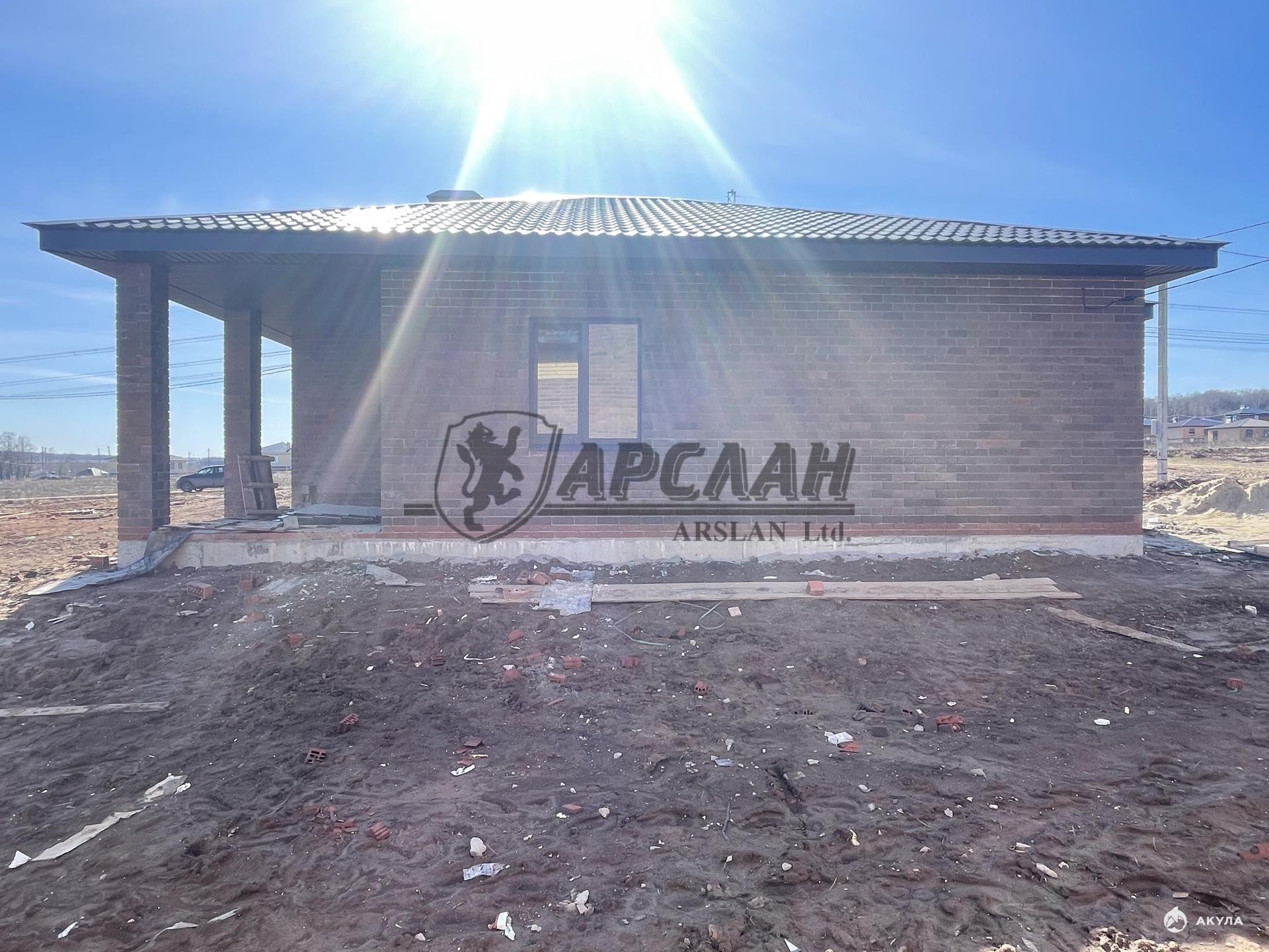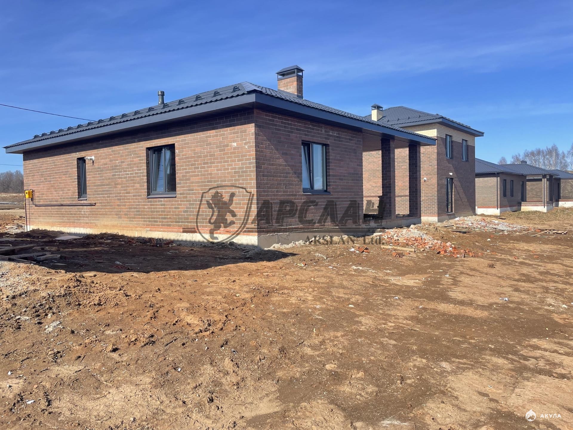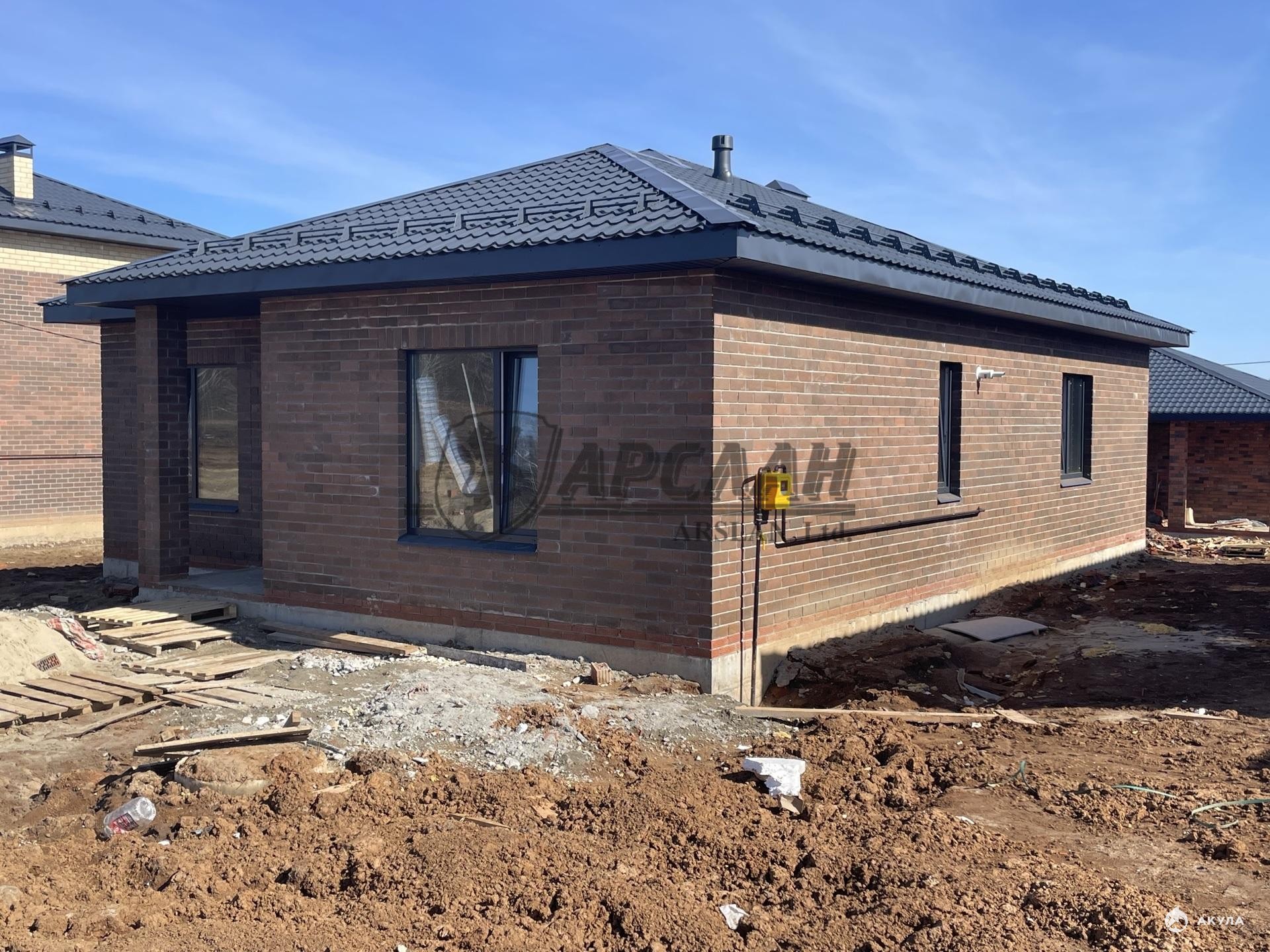 Новый одноэтажный кирпичный дом с террасой и котельной.