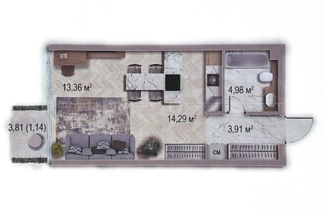 Квартира площадью 37 м2, с панорамным остеклением.