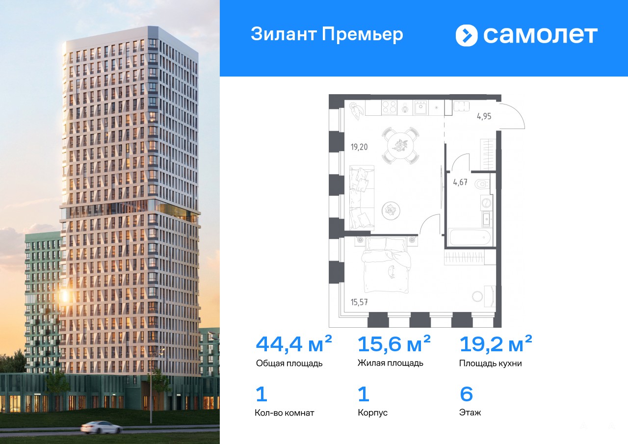 Строим кварталы для жизни с заботой о будущем. Предлагается 1-комнатная квартира комфорт-класса 44, 39 кв.м в корпусе 1 на 6 этаже, в ЖК «Зилант Премьер»