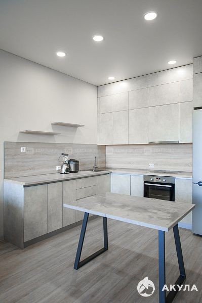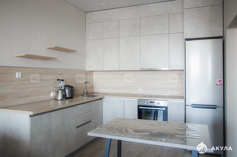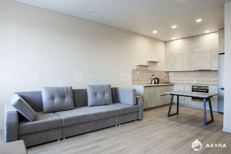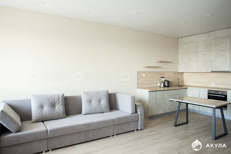 В квартире сделан хороший качественный ремонт, стены выровнены, на полу кварцвинил, отдельная кухонная зона с кухонным гарнитуром, который выполнен на заказ.