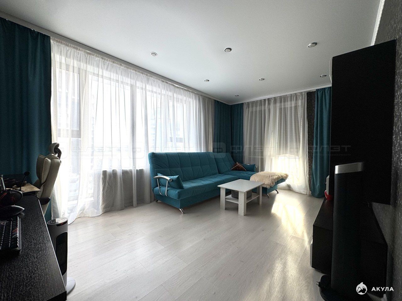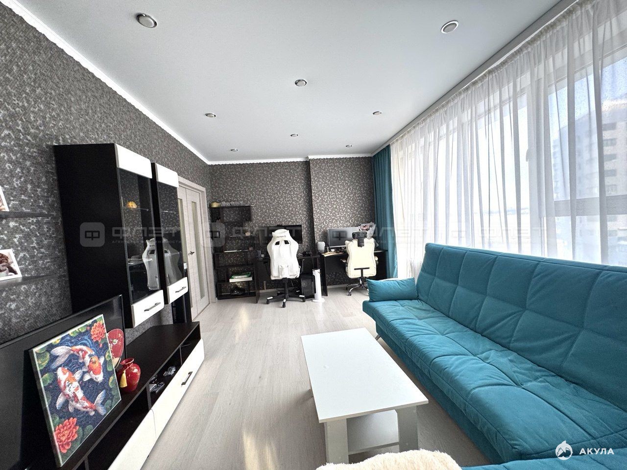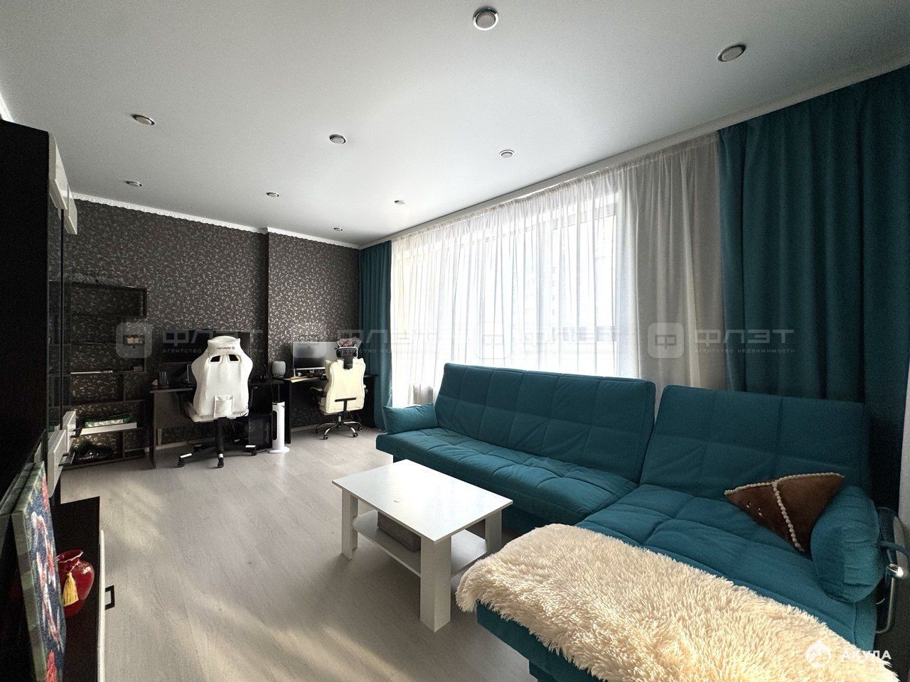 Главное преимущество — захватывающий вид на реку Казанку и центр города через большие панорамные окна. Квартира полностью готова к проживанию, укомплектована мебелью.