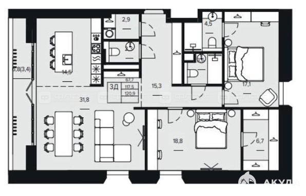 Объект №116694 Квартира бизнес класса в центре . Дом сданПРОДАЁТСЯ 3-комнатная квартира 120, 9 м² в клубном доме «Дом Аристократ», черновая отделкаРедкое предложение в премиальном малоквартирном доме «Дом Аристократ» на ул. Хади Атласи. Квартира тип 3Д, расположена на 4 этаже, с продуманной функциональной планировкой и большими окнами.Преимущества квартиры • Общая площадь: 120, 9 м² • Просторная кухня-гостиная 31, 8 м² с выходом на балкон • Мастер-спальня 18, 8 м² с собственным санузлом и гардеробной • Вторая спальня 17, 1 м² • Гардеробная комната 6, 7 м² • Отдельный гостевой санузел + хозяйственный блок • Удобный холл 15, 3 м², правильная прямоугольная геометрия • Черновая отделка — можно реализовать любой дизайн-проект без демонтажа прежних материаловО доме • Клубный формат — всего 4 этажа и ограниченное число квартир • Закрытая территория, видеонаблюдение • Продуманная архитектура, тишина и приватность • Собственная котельная: комфортная температура круглый год • Удобное расположение в исторической части городаИдеально подходит для • ценителей камерных домов премиум-класса; • семьи, желающей жить в стильном и спокойном месте; • тех, кто хочет создать индивидуальный интерьер под себя с нуля.