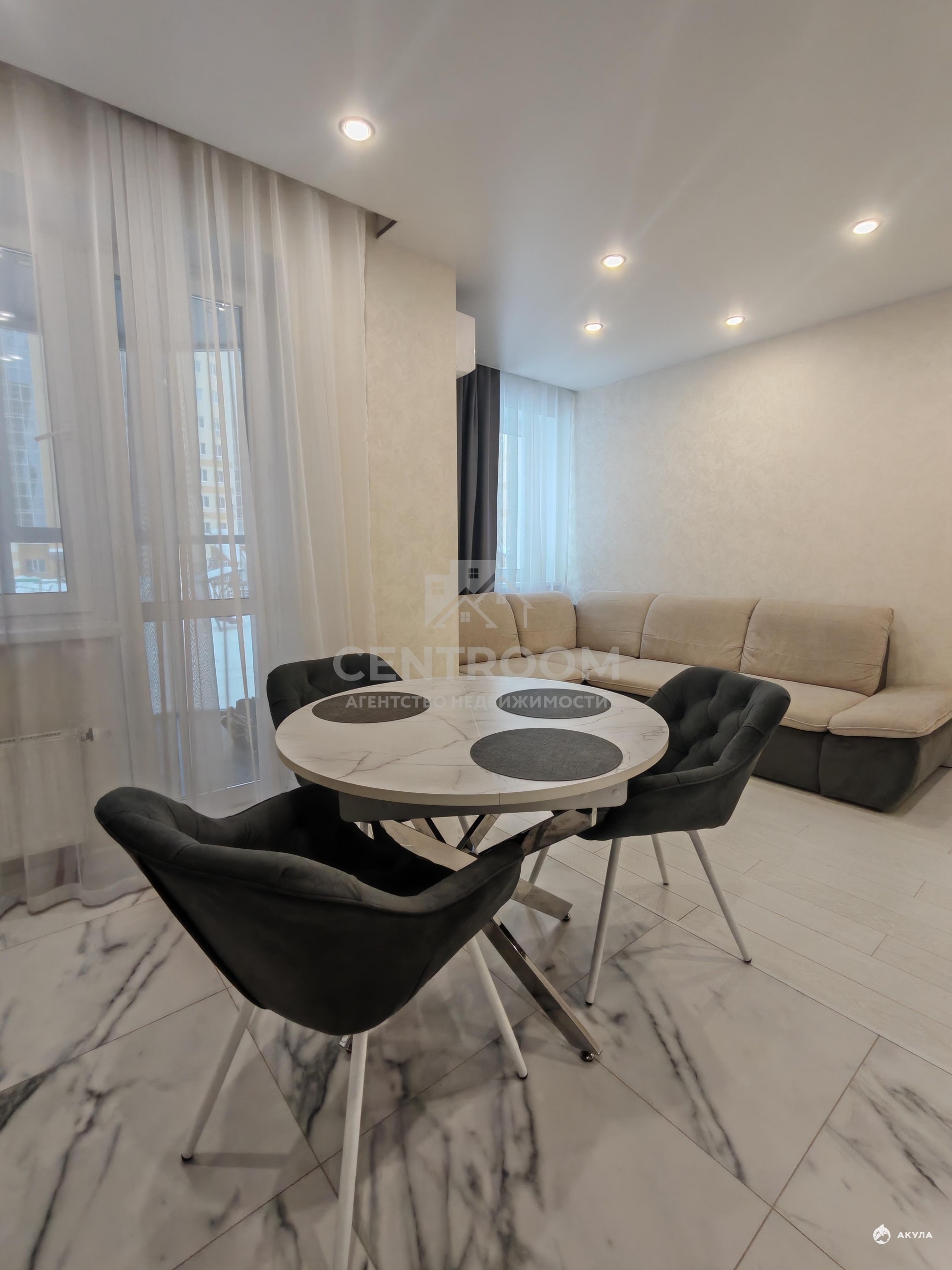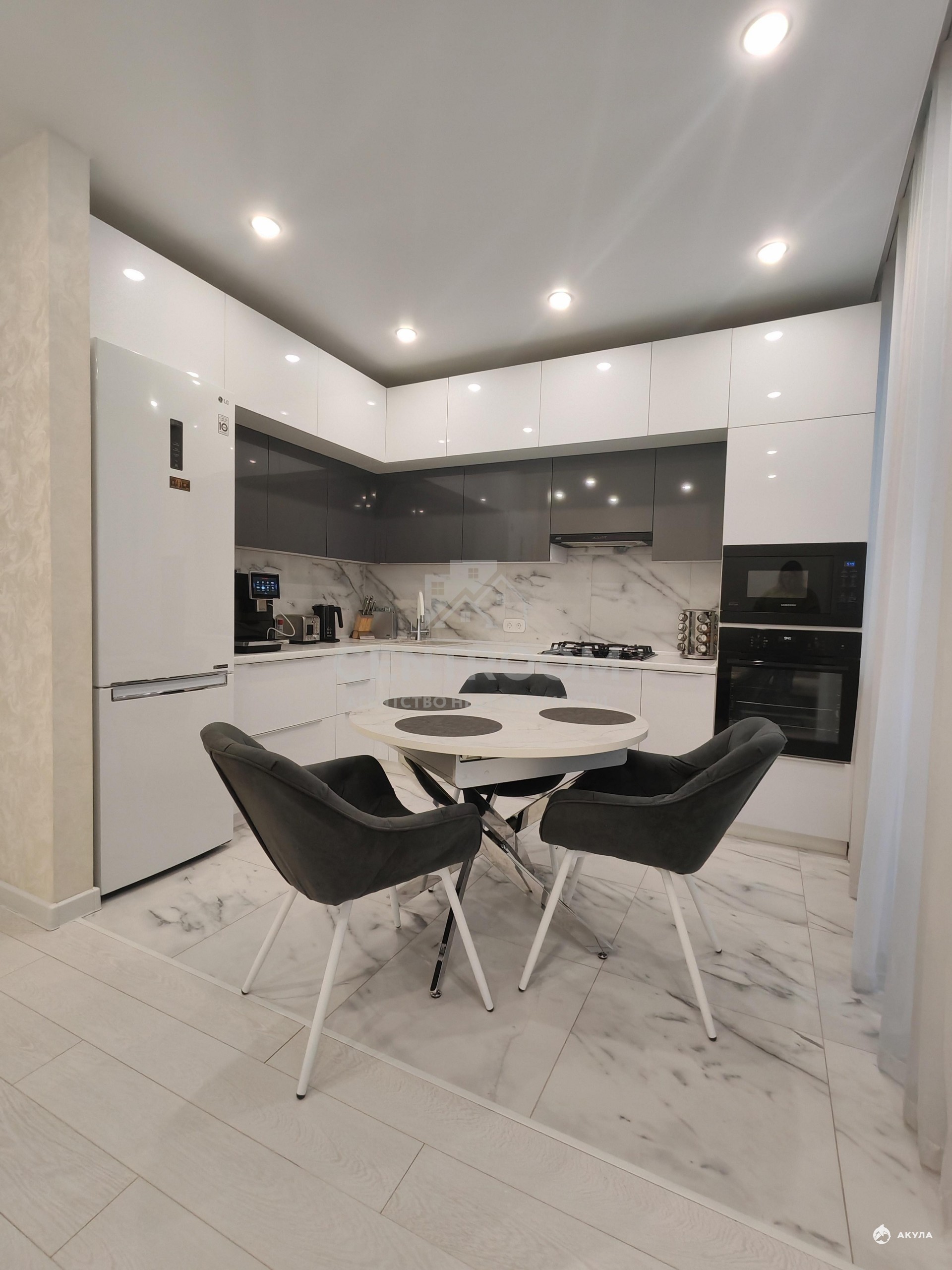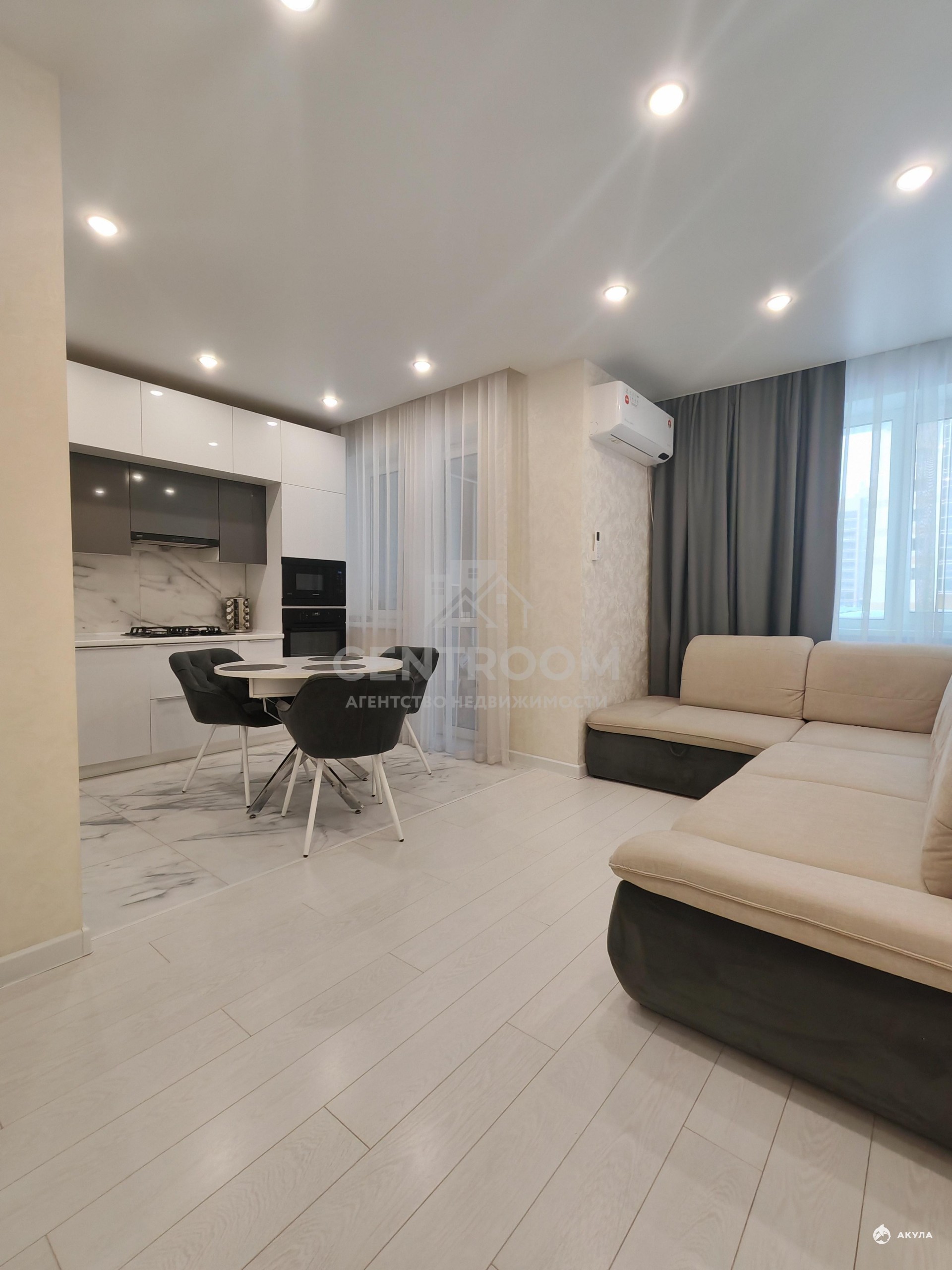 Просторная кухня-гостиная с кондиционером и выходом на лоджию с панорамными окнами — отличное место для встреч и отдыха всей семьей