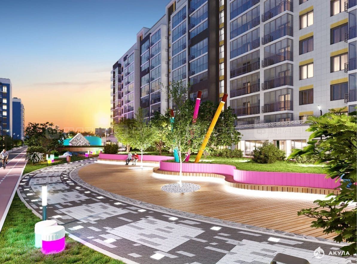 + пешеходный бульвар, с фонтаном, вело-дорожками, зонами отдыха, детскими площадками.