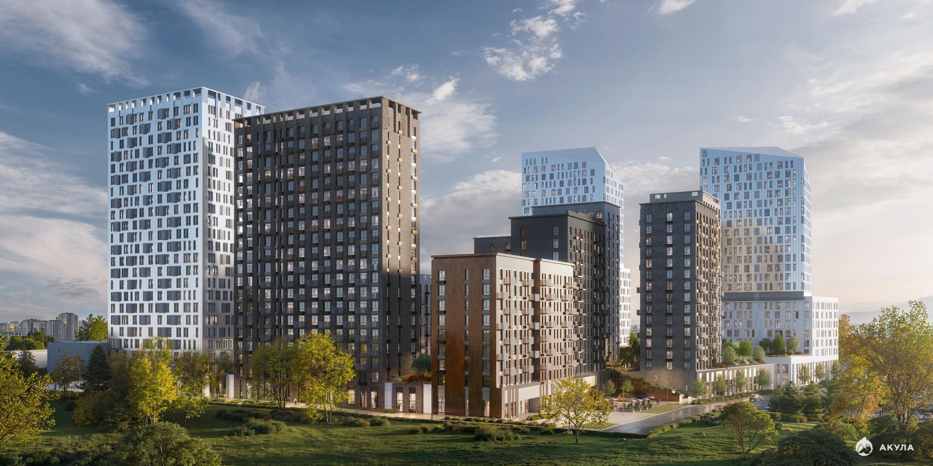 Manzara Towers — это дома высотой от 7 до 24 этажей. В увеличенных окнах с зеркальной поверхностью отражаются облака и солнечные блики.