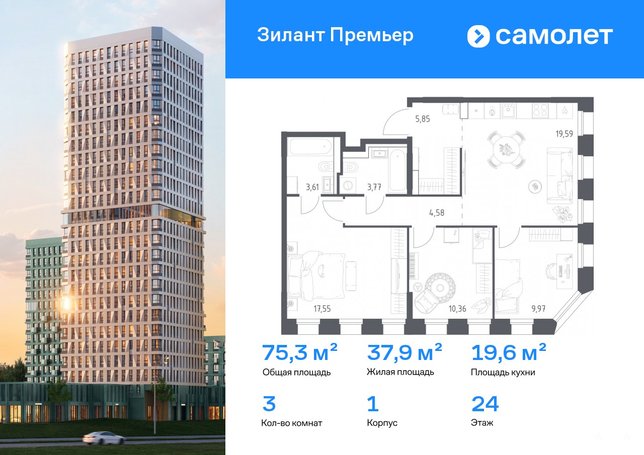 Строим кварталы для жизни с заботой о будущем. Предлагается 3-комнатная квартира комфорт-класса 75, 28 кв.м в корпусе 1 на 24 этаже, в ЖК «Зилант Премьер»