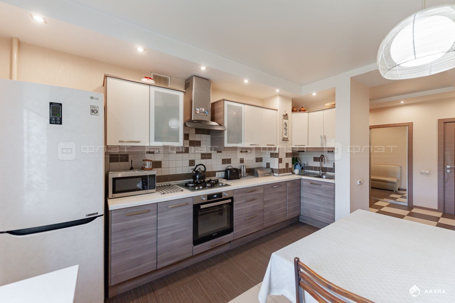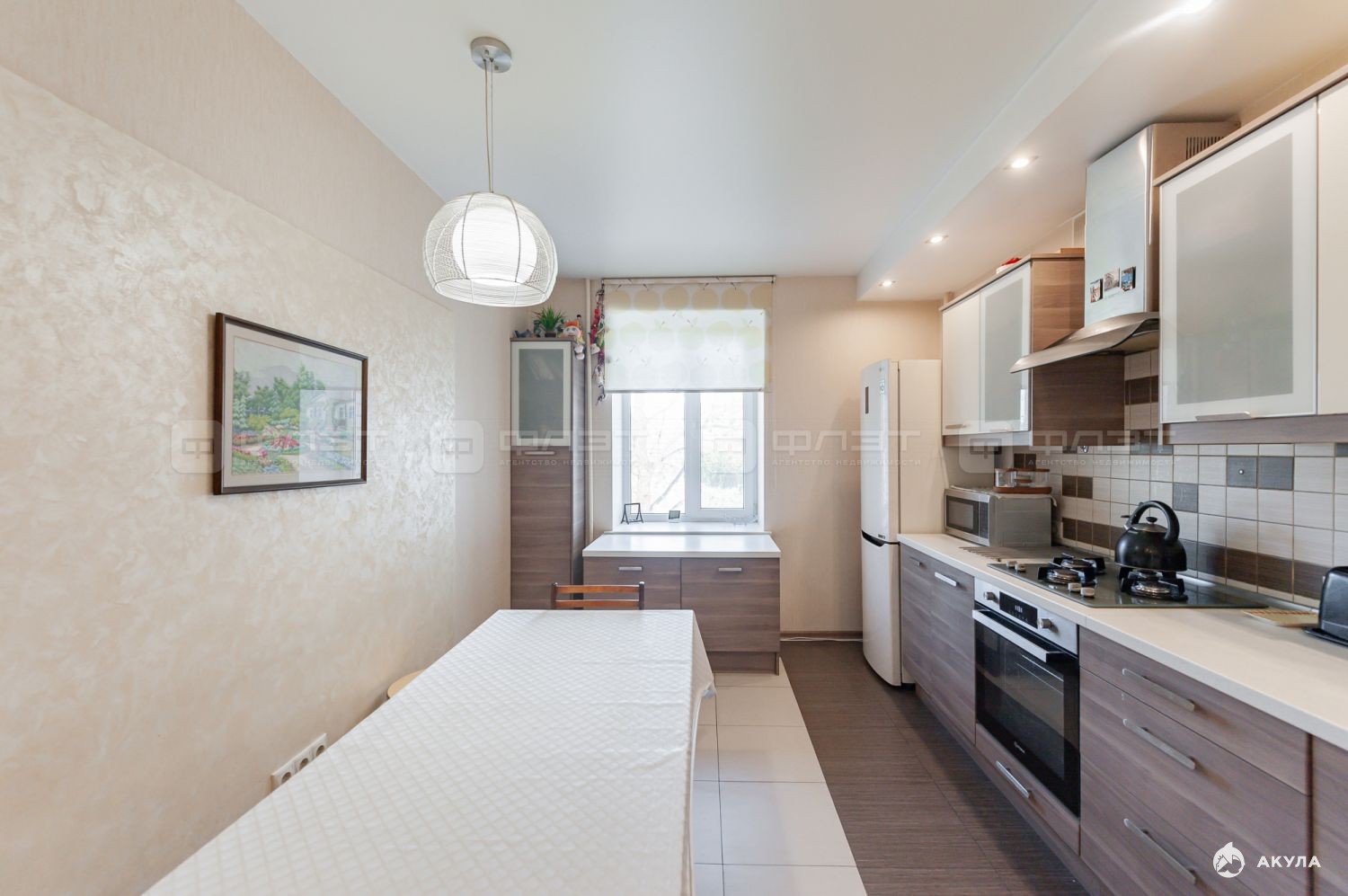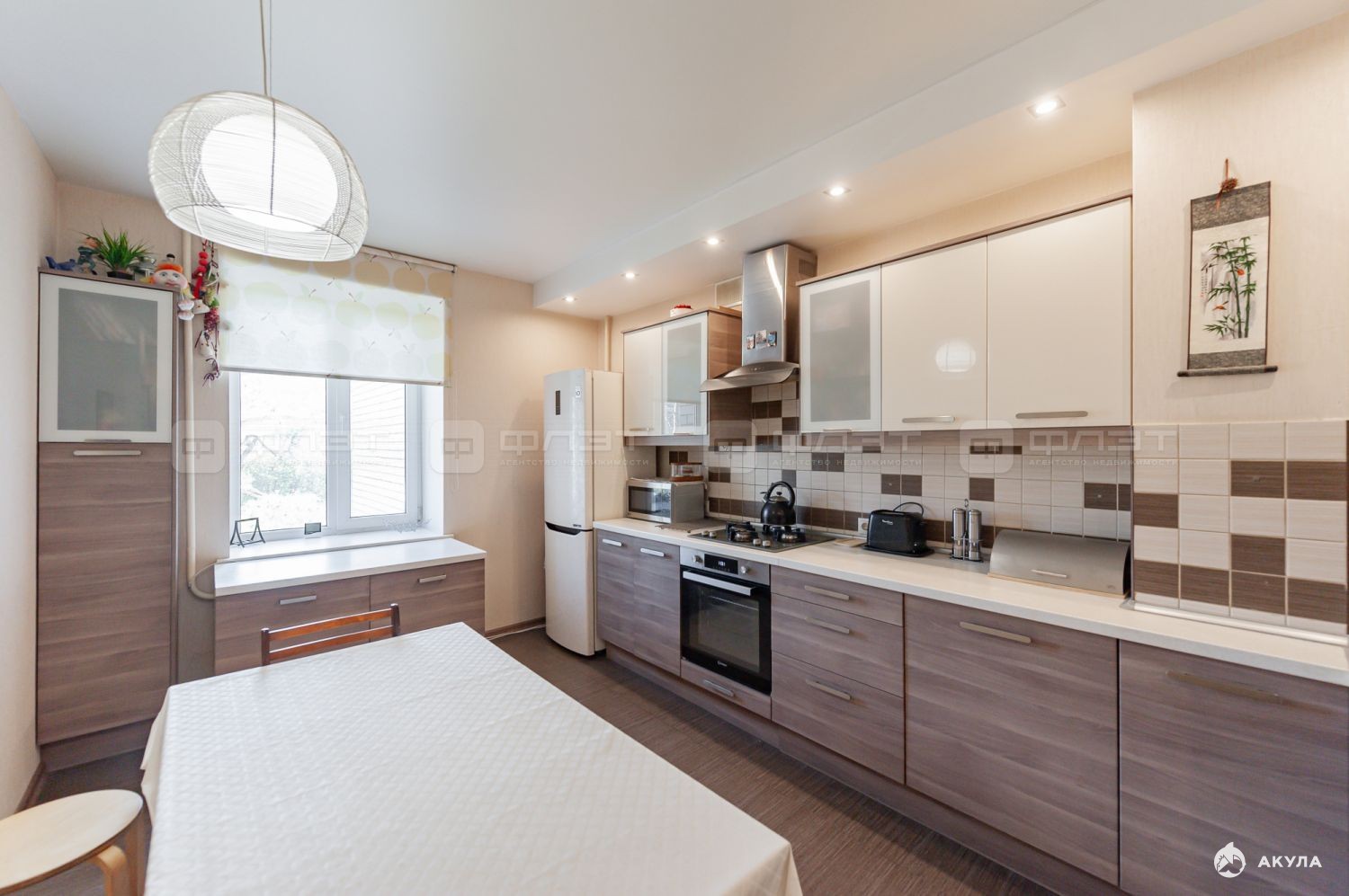 -кухня 12.1 м2 с кухонным гарнитуром и хорошей встроенной техникой: газовая панель и духовка Hotpoint Ariston, посудомоечная машина Siemens
