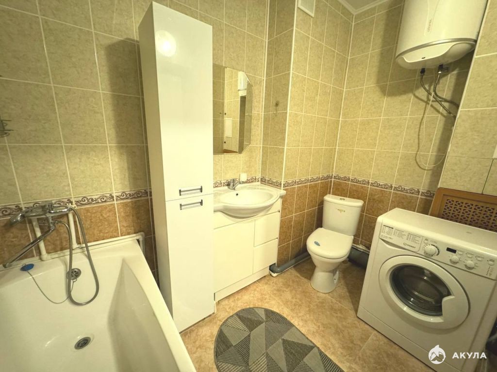 Вместительная кухня в приятных тонах, из кухни выход на остекленную лоджию. Санузел совмещенный, просторный, включает стиральную машину и водонагреватель на случай сезонного отключения горячей воды.