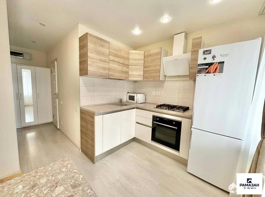 В квартире сделан евроремонт, который создаёт атмосферу уюта и комфорта. Имеется одна комната и кухня, оснащённая всей необходимой мебелью и техникой: холодильник, кондиционер, телевизор и стиральная машина. Ванная комната оборудована современной душевой кабиной. Также в квартире есть балкон, где можно наслаждаться видом на улицу.