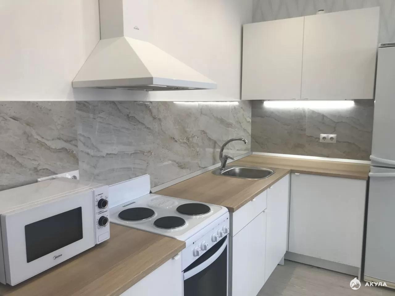 Есть все необходимое для комфортного проживания: двуспальная кровать с матрасом Аскона, кухонный гарнитур, электроплита с духовкой, микроволновка, телевизор, стиральная машина, 3-х створчатый шкаф. Окна выходят на лес.