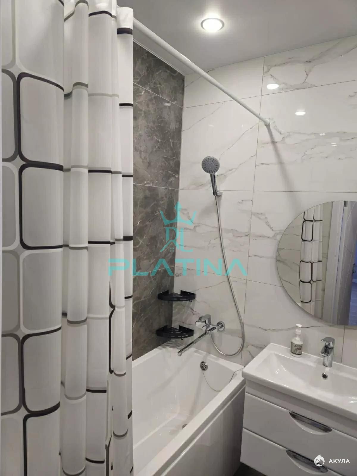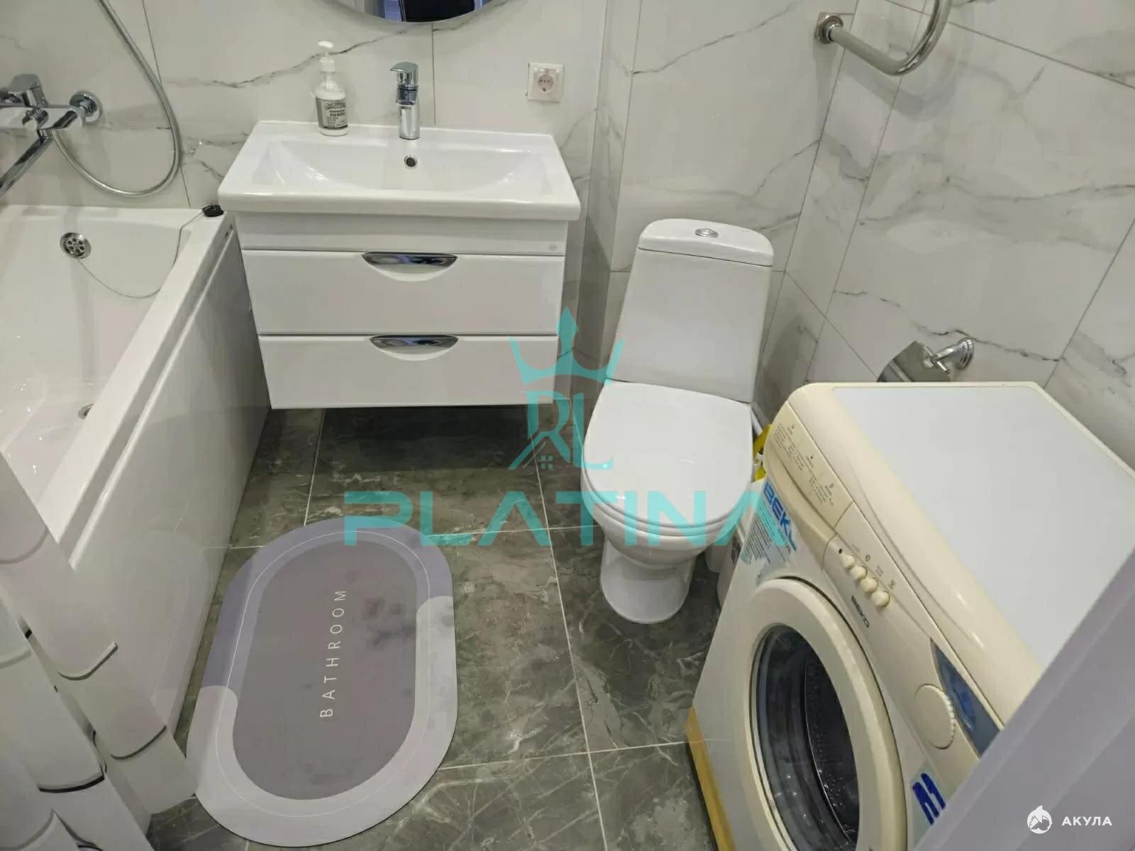 Санузел совмещенный, в нем есть ванна, зеркало и стиральная машина. Для вашего удобства установлены кондиционер и телевизор. Также имеется угловой диван и посуда.