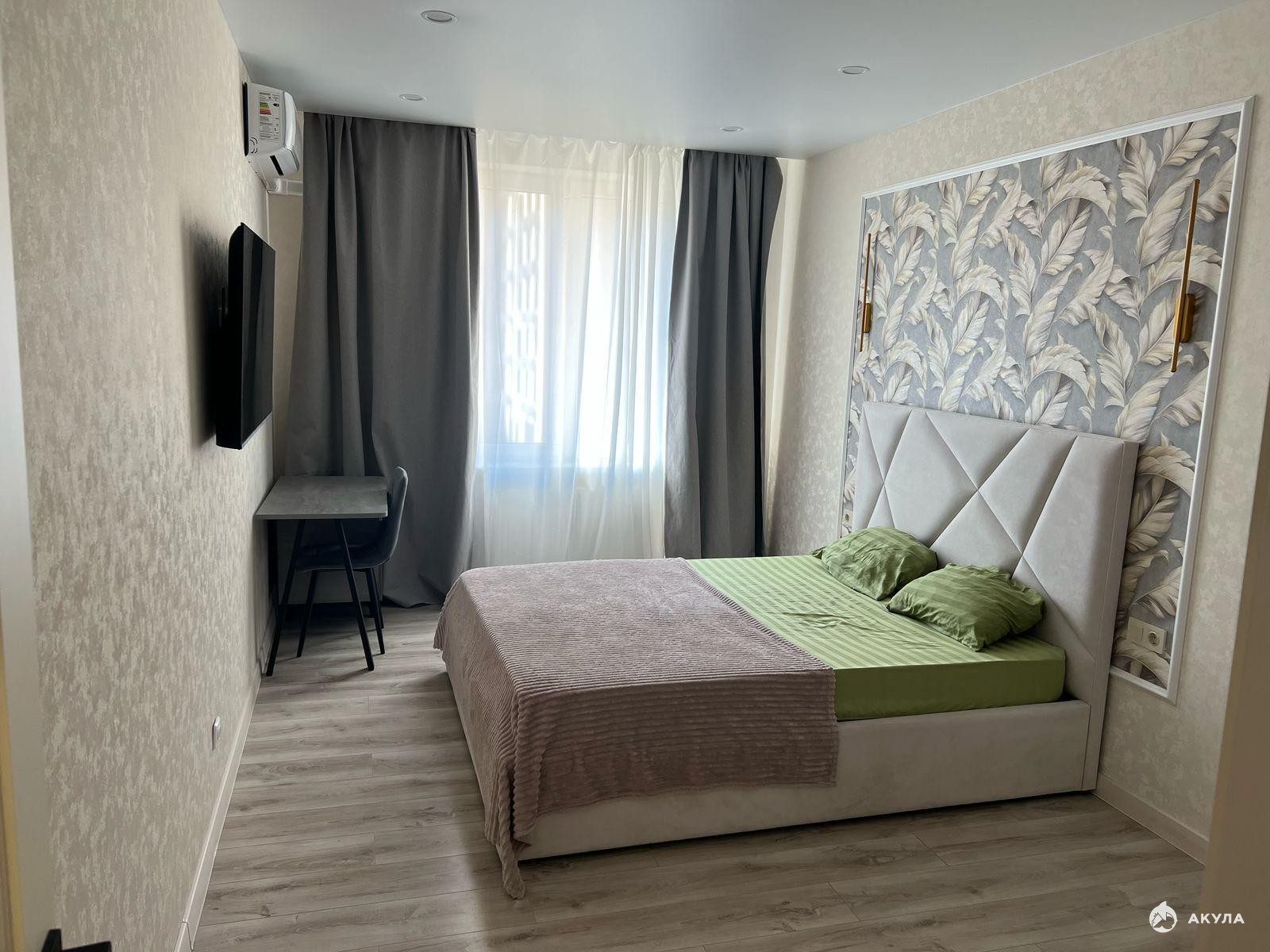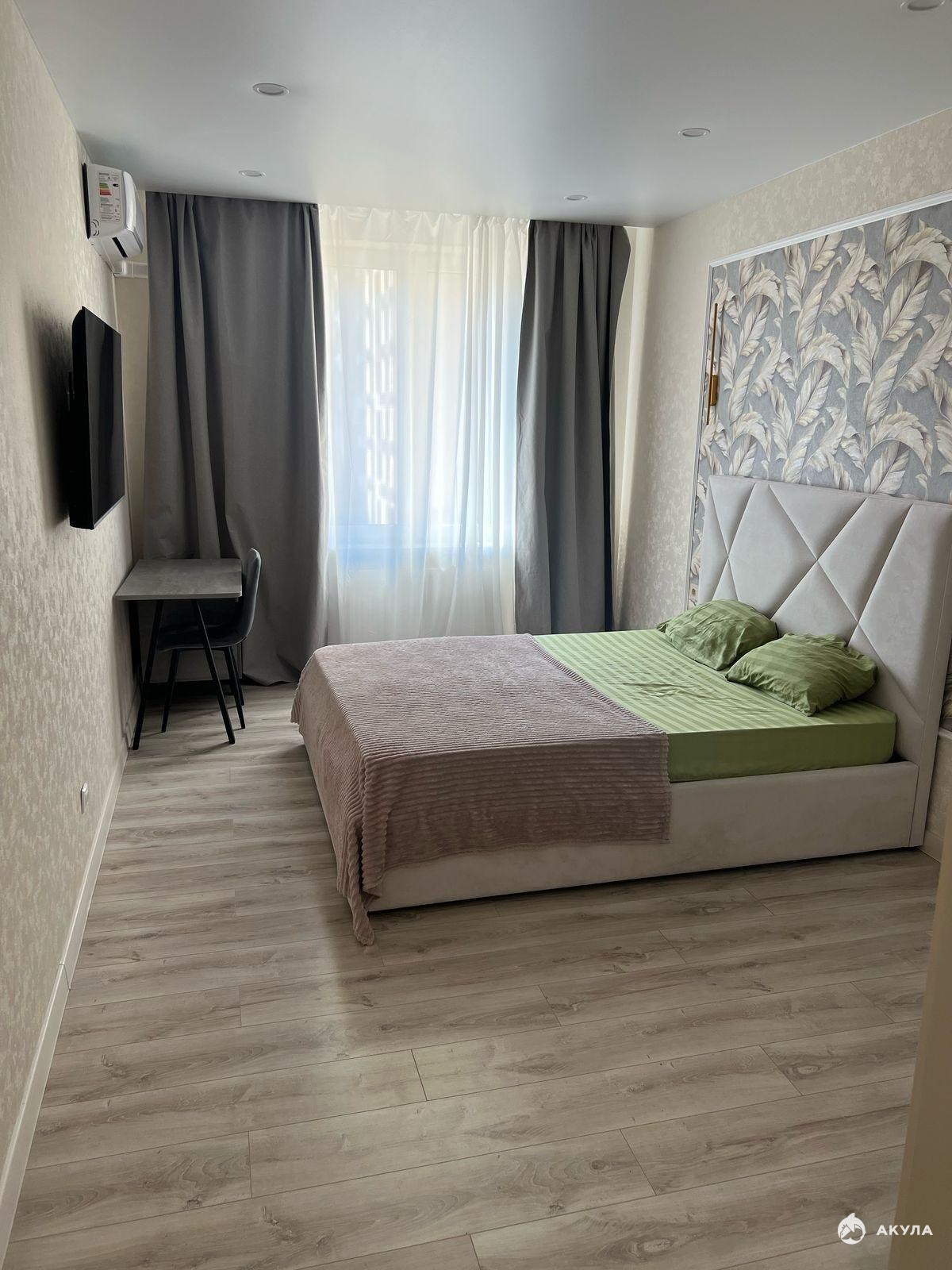 Спальная комната оборудована кроватью с ортопедическим матрасом.На кухне диван, как доп спальное место.