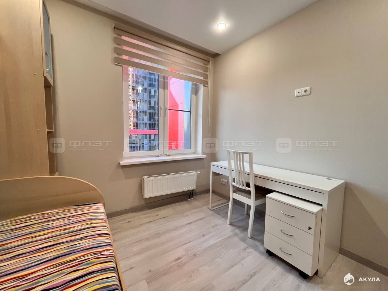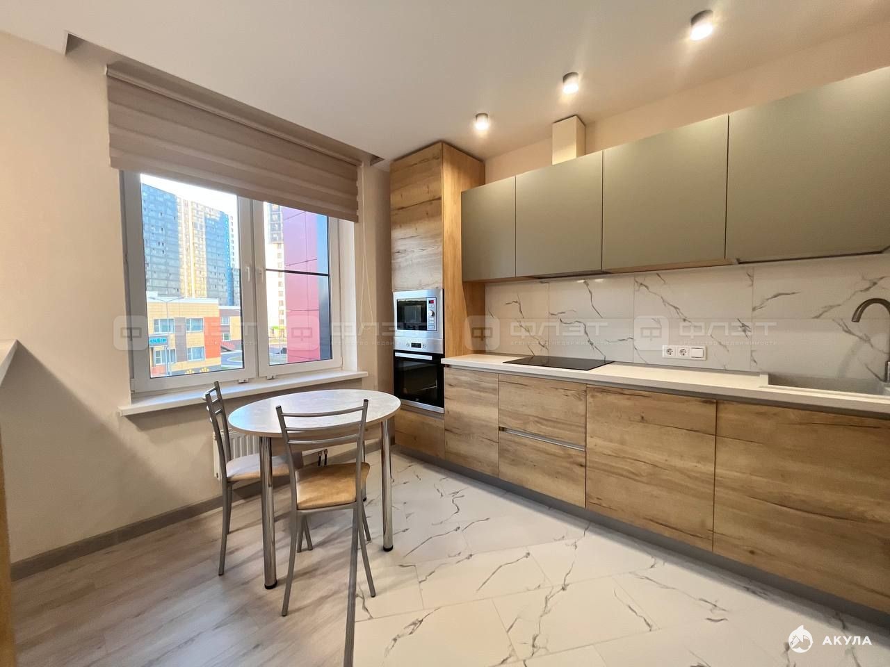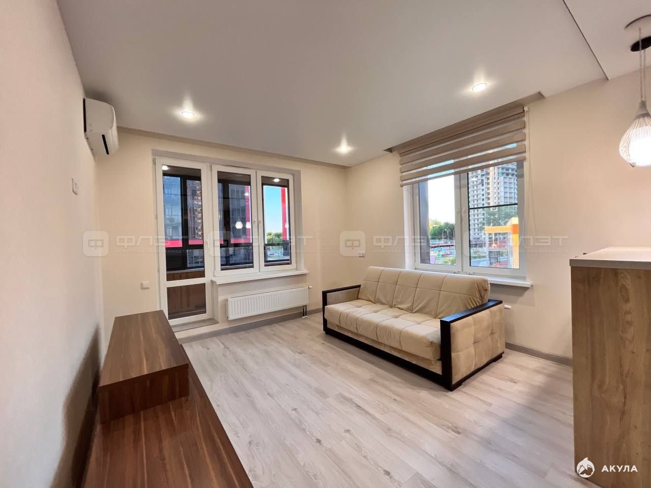 В квартире сделан современный ремонт. Полы: ламинат. Окна: пластиковые. Потолки: натяжные. Сан. узел в кафеле. Есть балкон.