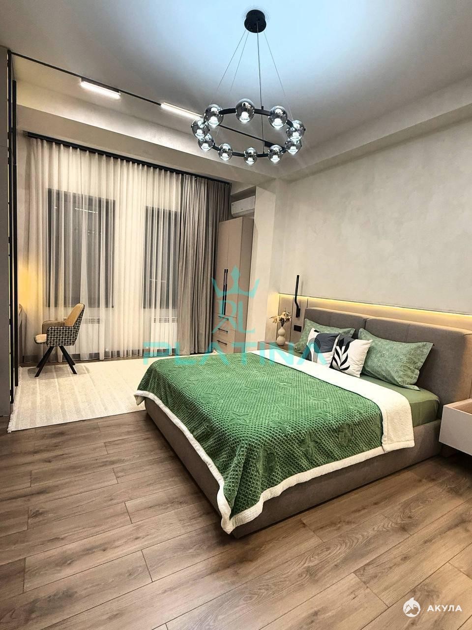✅ Планировка евро-трехкомнатной квартиры: Две уютные спальни, каждая оборудована удобной мебелью и современной техникой, одна спальня дополнительно предлагает встроенную гардеробную комнату.