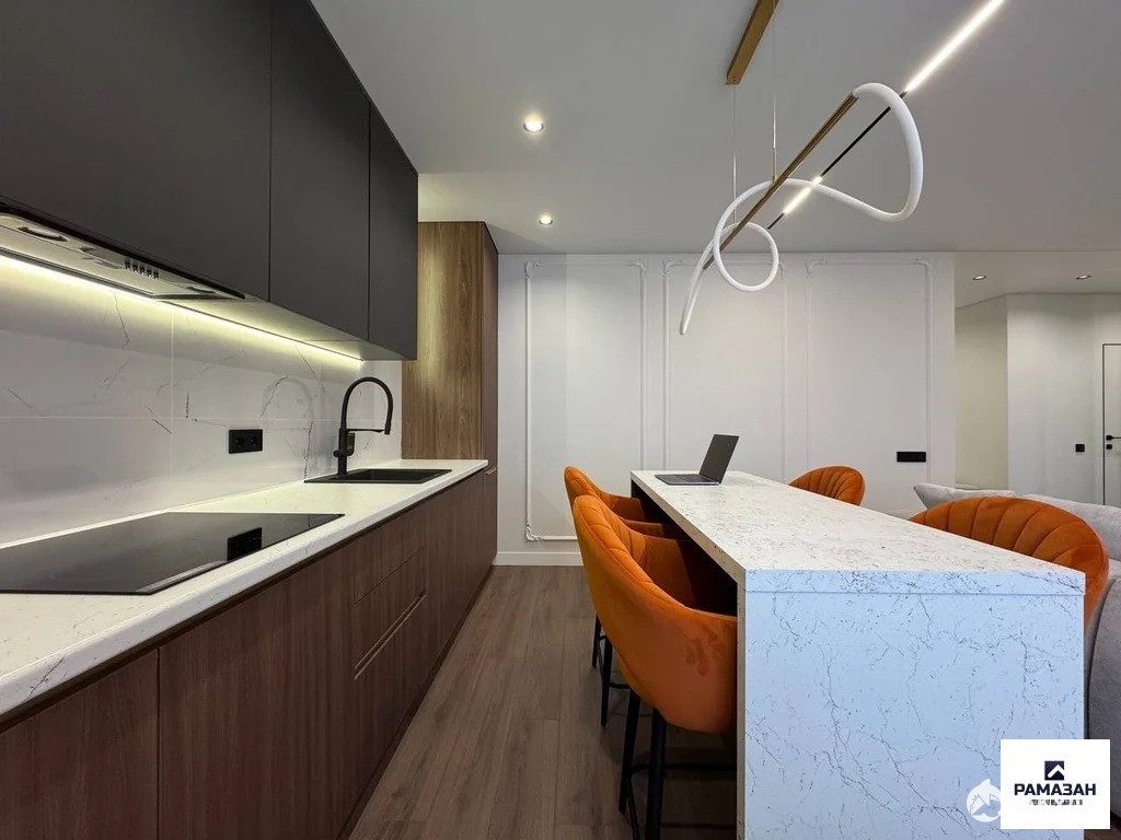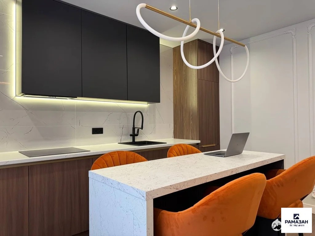 Интерьер квартиры выполнен с использованием современных дизайнерских решений. В просторной кухне площадью 13 кв. м есть вся необходимая мебель и техника, включая холодильник и посудомоечную машину. В комнатах установлены кондиционер и телевизор. Ванная комната оснащена как ванной, так и душевой кабиной. Окна квартиры выходят на улицу и во двор, что обеспечивает комфортное освещение в течение всего дня.