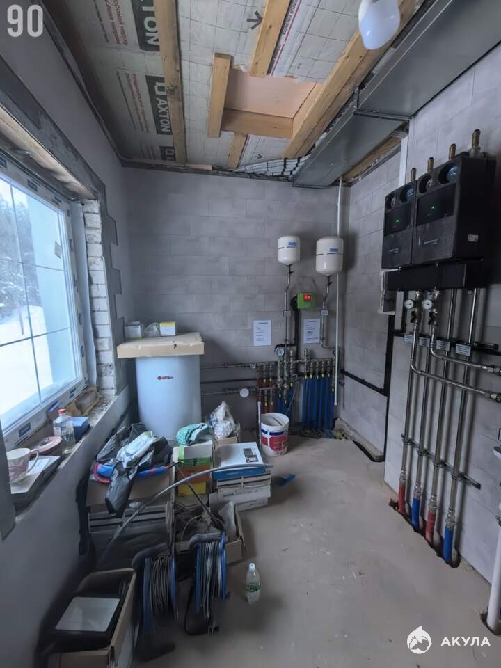 В котельной на стенах чистовая отделка, установлен немецкий котел Wolf, дом отапливается по системе «теплый пол» ( отопление функционирует, в доме тепло), водоснабжение и канализация проложена с возможностью подогрева. Канализация 2 ямы по 3 кольца 2 м с переливом.